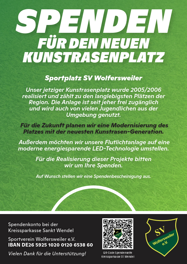 Der SV Wolfersweiler möchte seinen Kunstrasen sanieren und das Flutlicht auf moderne LED-Technik umstellen. Da wir das nur mit eurer Hilfe bewerkstelligen können, möchte wir unsere Mitglieder, Fans und Gönner animieren, sich an der Spendenaktion zu beteiligen. Wir brauchen eine Mindestquote, ohne die es nicht geht !